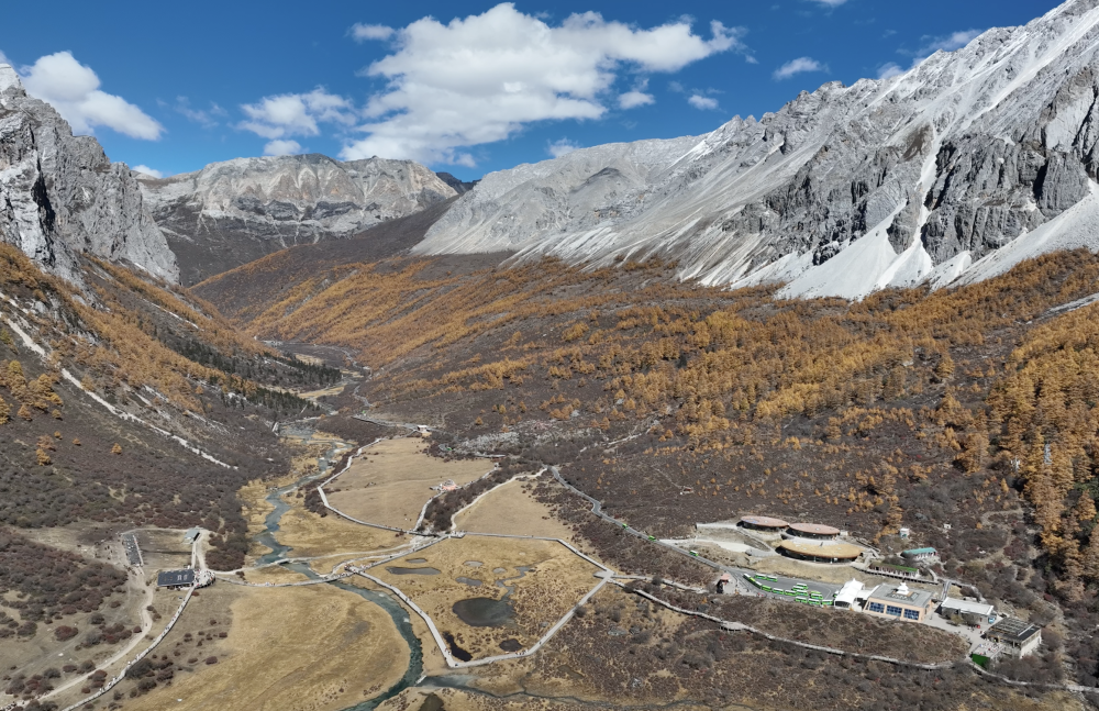 深秋的亞丁五彩斑斕,湛藍的天空下山谷秋葉繽紛、層林盡染,萬年的皚皚雪山與千年的蔚藍海子遙相呼應,黑色的犛牛多如繁星般點綴在金黃的草甸之上。漫步在洛絨牛場,幾條蜿蜒的小溪宛如一條條絲帶飄繞在草原上。仰頭環視,藏族羣眾心中的三座“神山”呈“品”字形矗立在遠處,守護着這片絕美淨土。