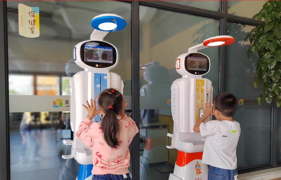 清晨,在烏鎮首個智慧化幼兒園——烏鎮龍翔中心幼兒園,憨態可掬的晨檢機器人代替老師與孩子們互動,並對他們進行健康測量。