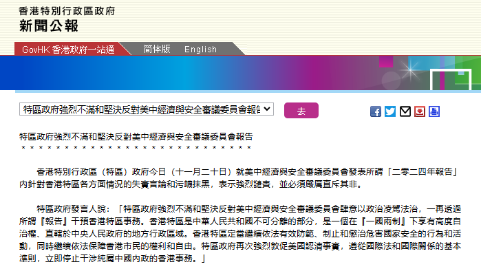 新聞公報稱,香港特區政府發言人説,特區政府強烈不滿和堅決反對美中經濟與安全審議委員會肆意以政治凌駕法治,一再通過所謂“報告”干預香港特區事務。香港特區是中華人民共和國不可分離的部分,是一個在“一國兩制”下享有高度自治權、直轄於中央人民政府的地方行政區域。香港特區定當繼續依法有效防範、制止和懲治危害國家安全的行為和活動,同時繼續依法保障香港市民的權利和自由。特區政府再次強烈敦促美國認清事實,遵從國際法和國際關係的基本準則,立即停止干涉純屬中國內政的香港事務。