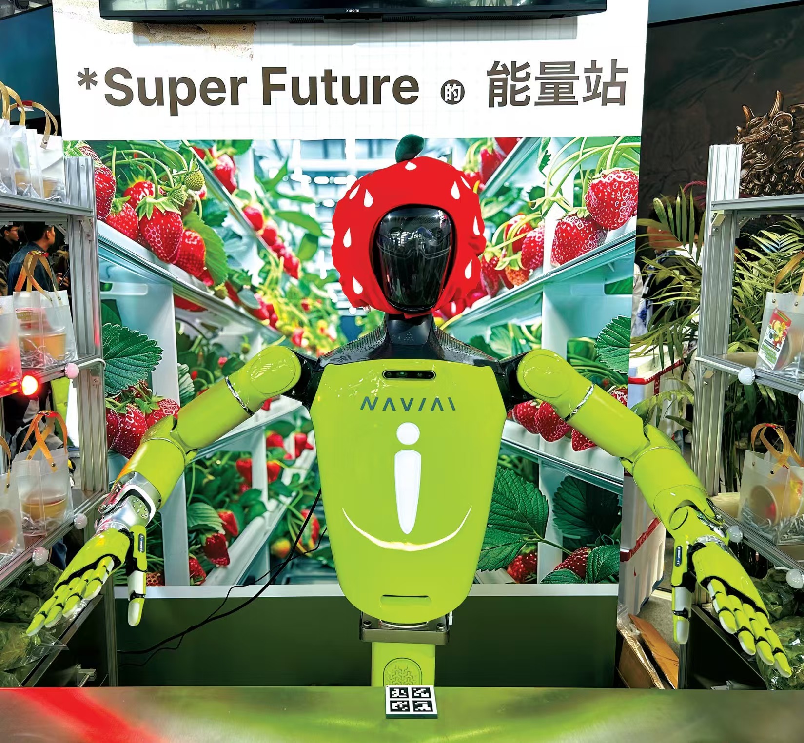 在“夏瀾”的旁邊,一名身着中國傳統服飾的機器人“清寶”,正在為觀眾表演舞蹈。記者瞭解到,在文旅場景,人形機器人已經可以充當“導遊”和“歌舞演員”的角色。貨架上擺放着草莓、蔬菜,中間站着一名機器人售貨員——在浙江人形機器人創新中心的展台,《環球時報》記者體驗了向人形機器人“小綠”買東西。“你好,小綠,我想買點東西。”“我們的草莓沒有農藥,每一口都很可口。”“我想來一份。”“請掃描二維碼支付。”當記者付錢後,“小綠”轉身面向貨架,從一堆貨物中識別出草莓並遞給記者。據現場工作人員介紹,從農場採摘到後期銷售,人形機器人如今都能勝任,而它們也有望成為未來“無人商店”的幫手。