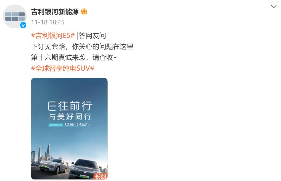 【環球網科技綜合報道】11月20日消息,吉利銀河新能源在社交平台發佈最新一期的“吉利銀河E5答網友問”,針對日常用車中的電池保養、充電功率顯示差異等問題,為車主提供瞭解答和建議。