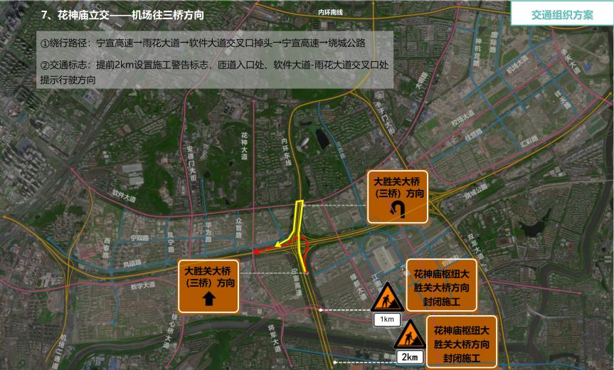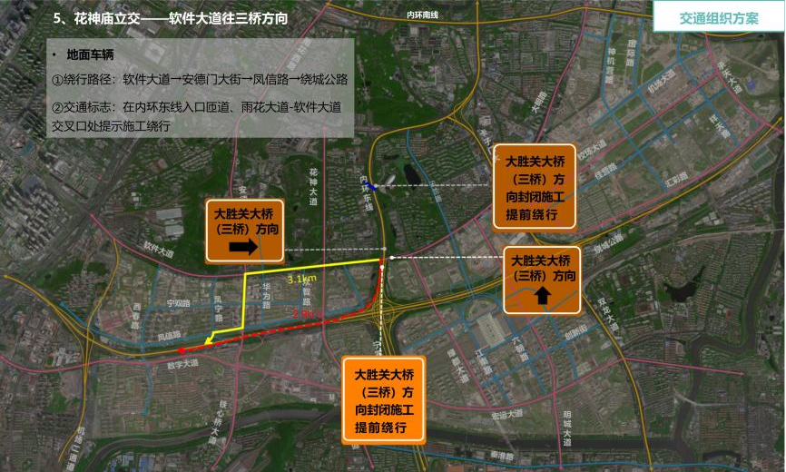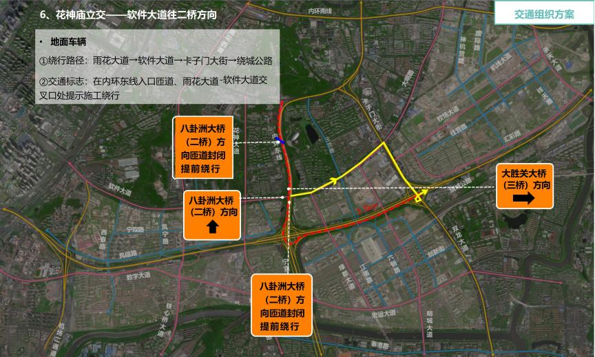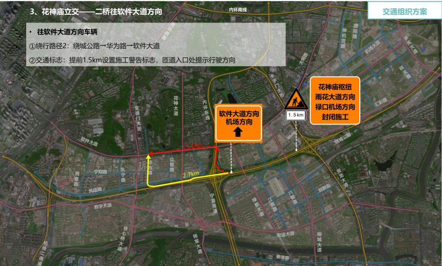 二、第二階段(花神廟立交二橋往軟件大道方向匝道、二橋往機場方向匝道、軟件大道往三橋方向匝道、軟件大道往二橋方向匝道、機場往三橋方向匝道,約15天)