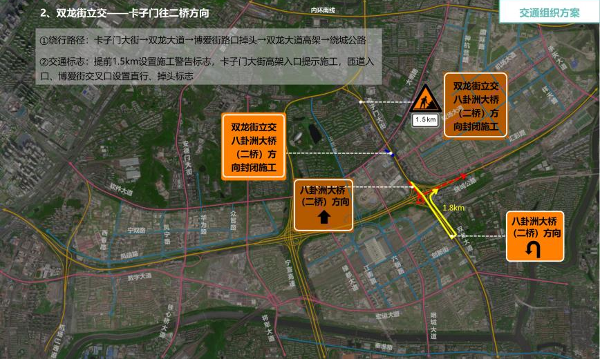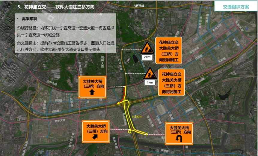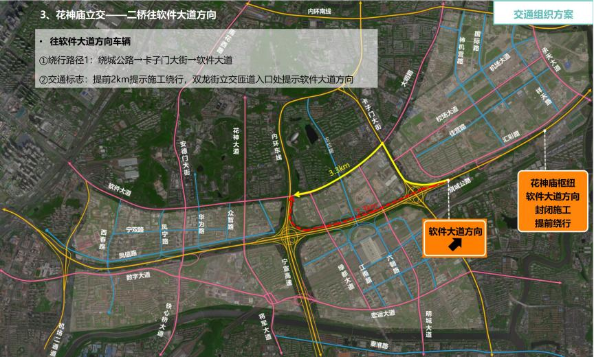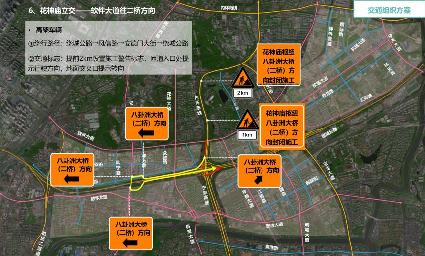 *本次施工涉及的匝道包括:*雙龍街立交東山往三橋方向匝道、卡子門往二橋方向匝道;花神廟立交二橋往軟件大道方向匝道、二橋往機場方向匝道、軟件大道往三橋方向匝道、軟件大道往二橋方向匝道、機場往三橋方向匝道;雙麒路互通(三橋往二橋方向)繞城主線往雙麒路匝道;繞城公路(二橋往三橋方向)進出南京南站匝道。具體施工日期為11月20日至12月17日。