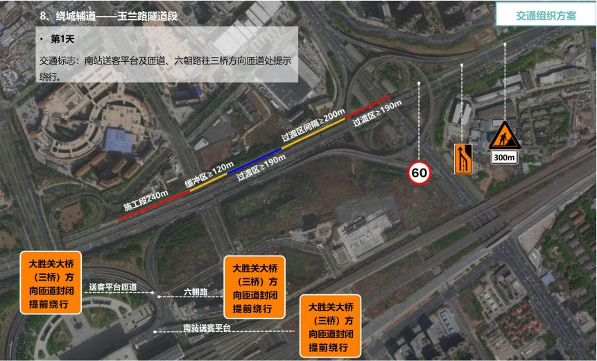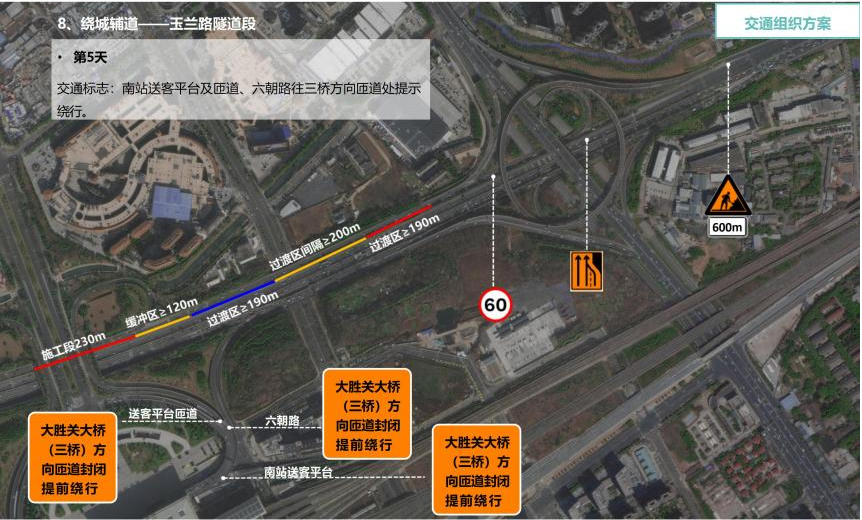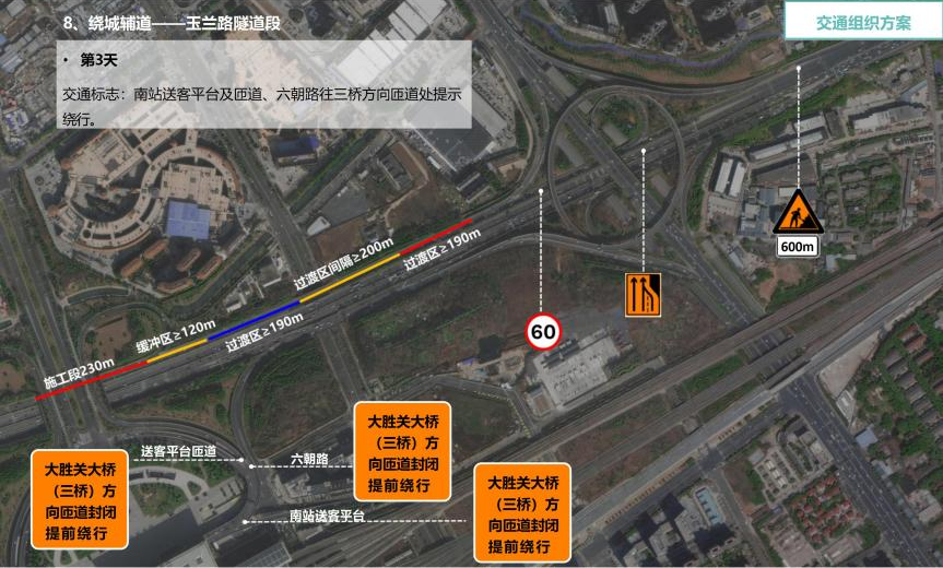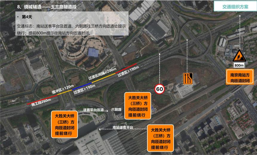 按車道交替施工,施工期間23:00後南站、六朝路往三橋方向匝道封閉;第四天起,進出南站的匝道全封閉。