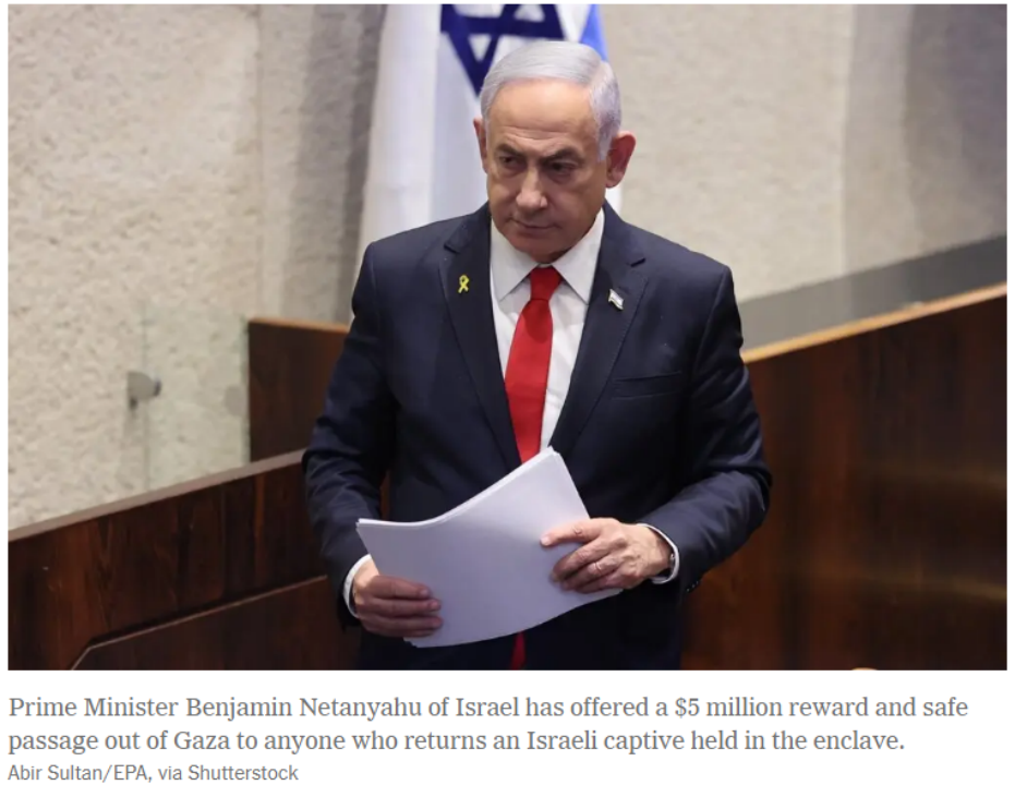 據美國《紐約時報》19日報道,以色列總理內塔尼亞胡宣佈,如果有誰能使在加沙地帶的被扣押人員獲釋,以方將為每名人質支付500萬美元,並向對方提供離開加沙的“安全出路”。他還重申,如果被扣押人員受到傷害,以方將繼續追捕和懲罰相關肇事者。