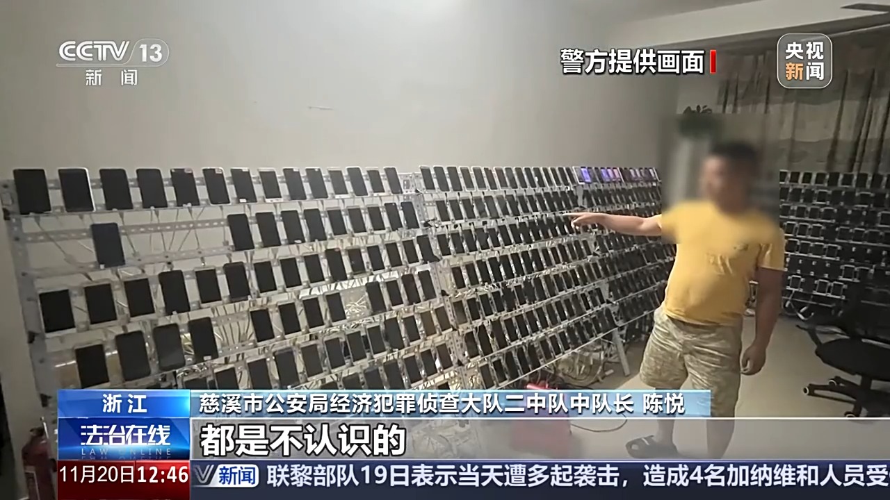 *慈谿市公安局網絡警察大隊副大隊長 陳威曄:*我們在江西贛州一個比較破舊的民房裏面很隱蔽的地方,找到了工作室,走到房間的時候,我們進去以後就發現房間裏大概有600部工作機,有一部分還在進行一個上人氣的操作。
