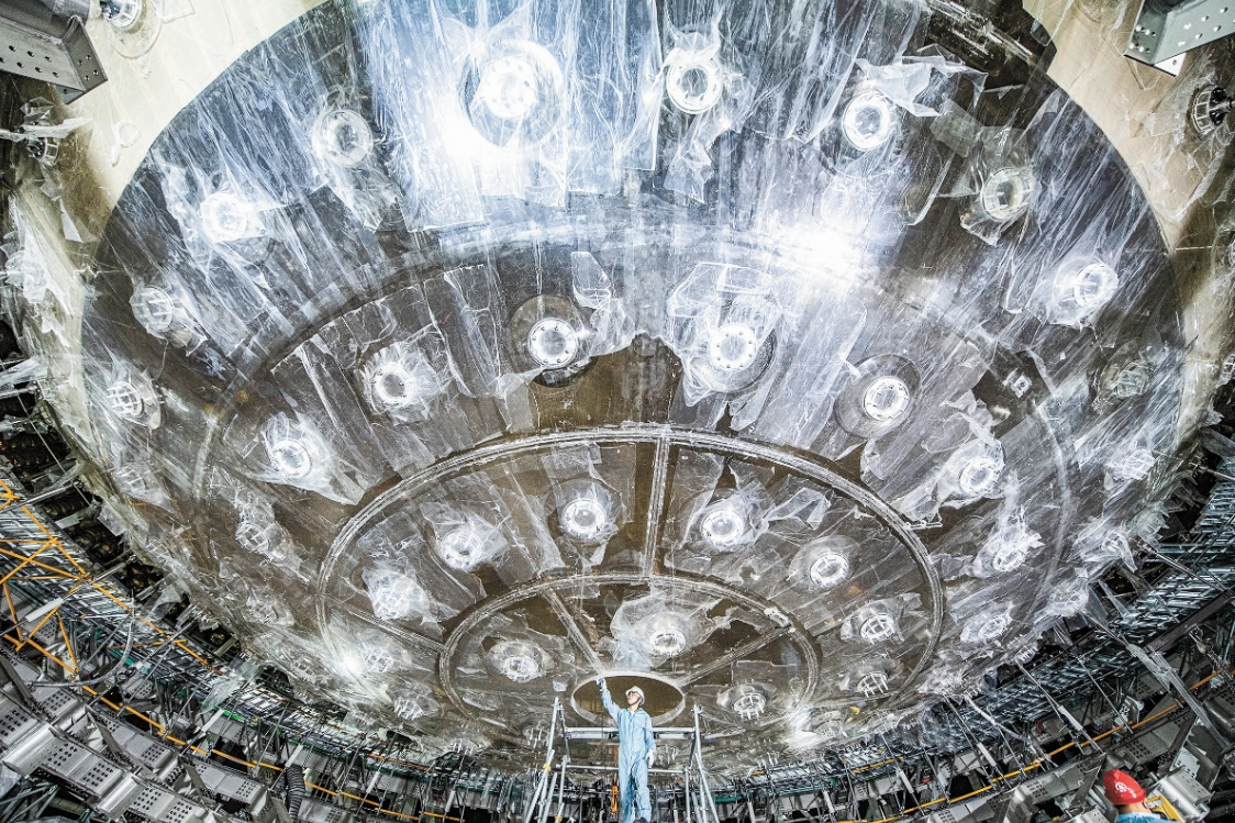 除了建在地下深處,外界還對這個能捕獲中微子的大科學裝置長什麼樣充滿好奇。據報道,從上空俯瞰,江門中微子實驗裝置的主體就像一個泡在水中的西瓜,整個球體構成了世界上能量精度最高、規模最大的液體閃爍體探測器。核心探測設備位於地下700米的實驗大廳內44米深的水池中央,它由直徑41米的不鏽鋼網殼、直徑35.4米的有機玻璃球,以及數萬噸液體閃爍體、4.5萬個光電倍增管等關鍵部件組成。