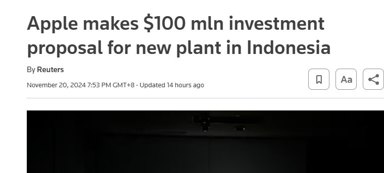 外媒:蘋果計劃在印度尼西亞投資1億美元建新工廠