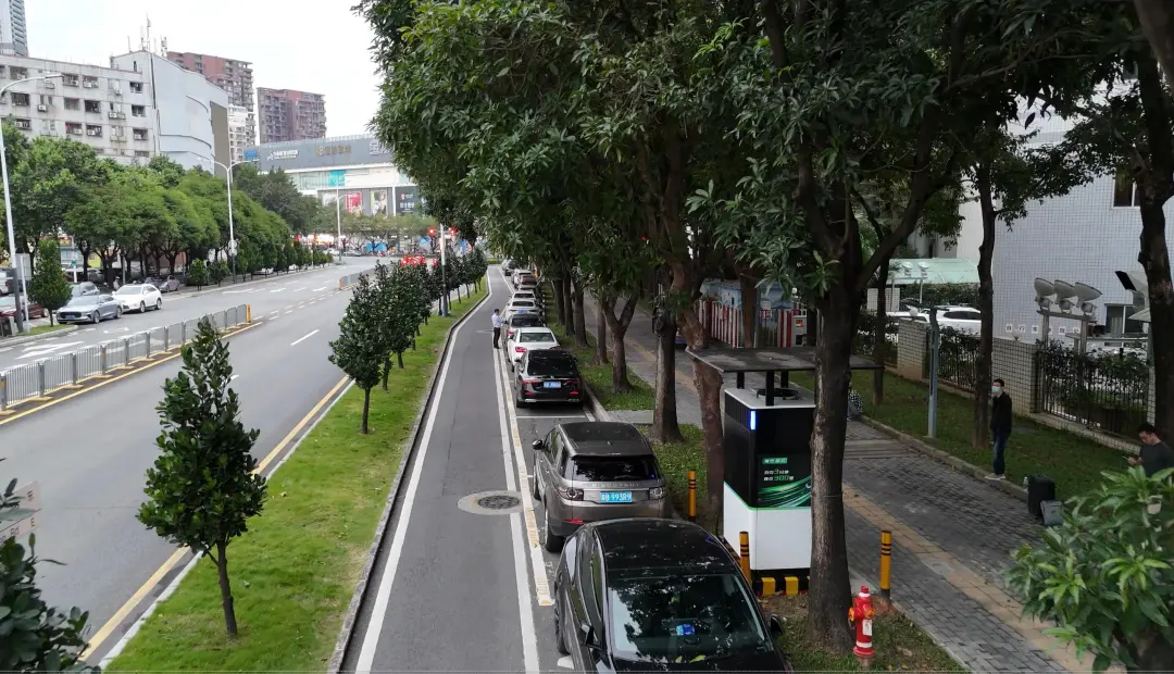 路側超充站選址於龍崗區德政路的路邊停車位,充分利用了城市公共空間,有效節約了土地資源。車主在享受2小時免費停車的同時,可以迅速完成充電,實現即充即走,極大提高了充電的便捷性。此外,該超充站的建設成本也相對較低,可直接接入市政電箱,無需增設變壓器。