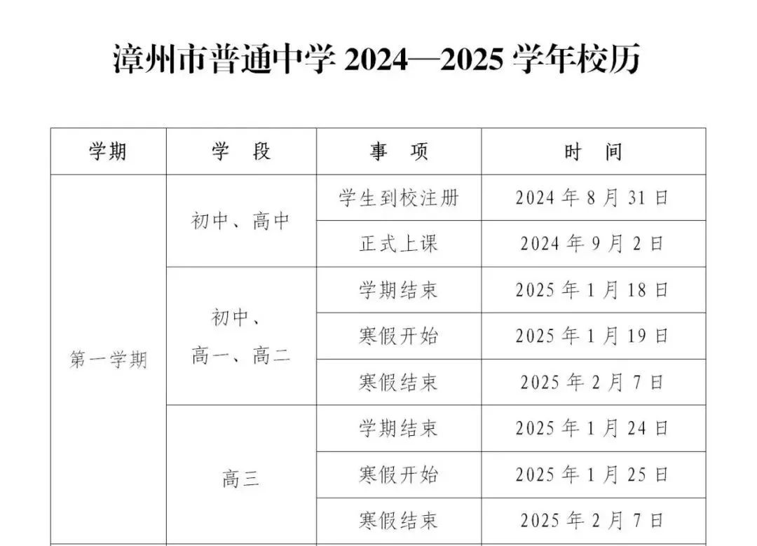 普通高中於2025年1月24日學期結束,寒假從1月25日(農曆十二月二十六)至2月16日(農曆正月十九)。