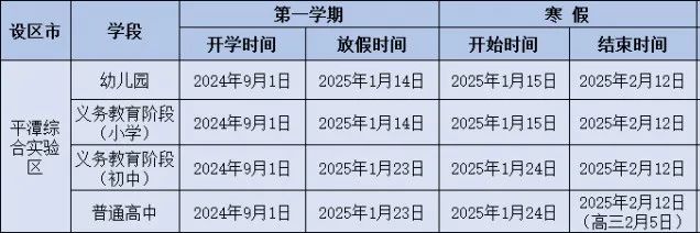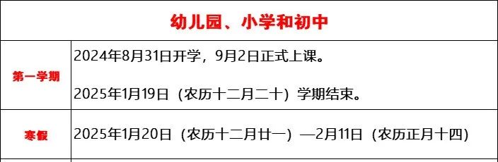 小學、初中於2025年1月17日學期結束,寒假從1月18日(農曆十二月十九)至2月16日(農曆正月十九)。