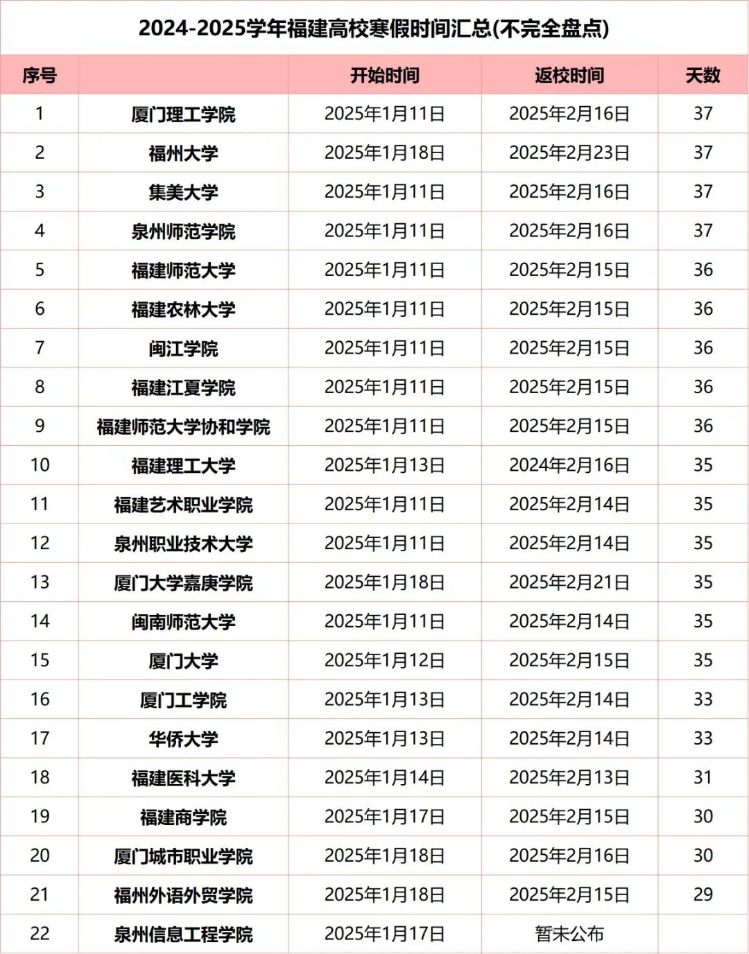 目前,超20所福建高校已公佈寒假時間。大部分高校的寒假從2025年1月中上旬開始,2月中下旬結束,寒假天數在29天到37天。