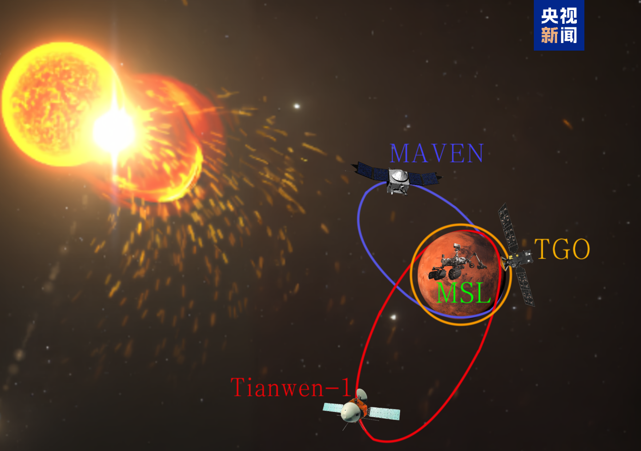 △圖示:2022年2月15日太陽高能粒子事件同時被中國的天問一號軌道器(Tianwen-1)、歐州航天局的微量氣體軌道飛行器(TGO)、美國航空航天局的火星大氣和揮發性演化軌道器(MAVEN)以及火星表面的好奇號火星車(MSL)探測到。