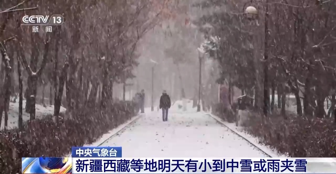 明天,新疆北部和西南部、西藏東部等地部分地區有小到中雪或雨夾雪,其中,新疆沿天山北部局地有大雪。西南地區大部、海南島、台灣島大部等地部分地區有小雨,其中,雲南西南部和中部等地部分地區有中雨。