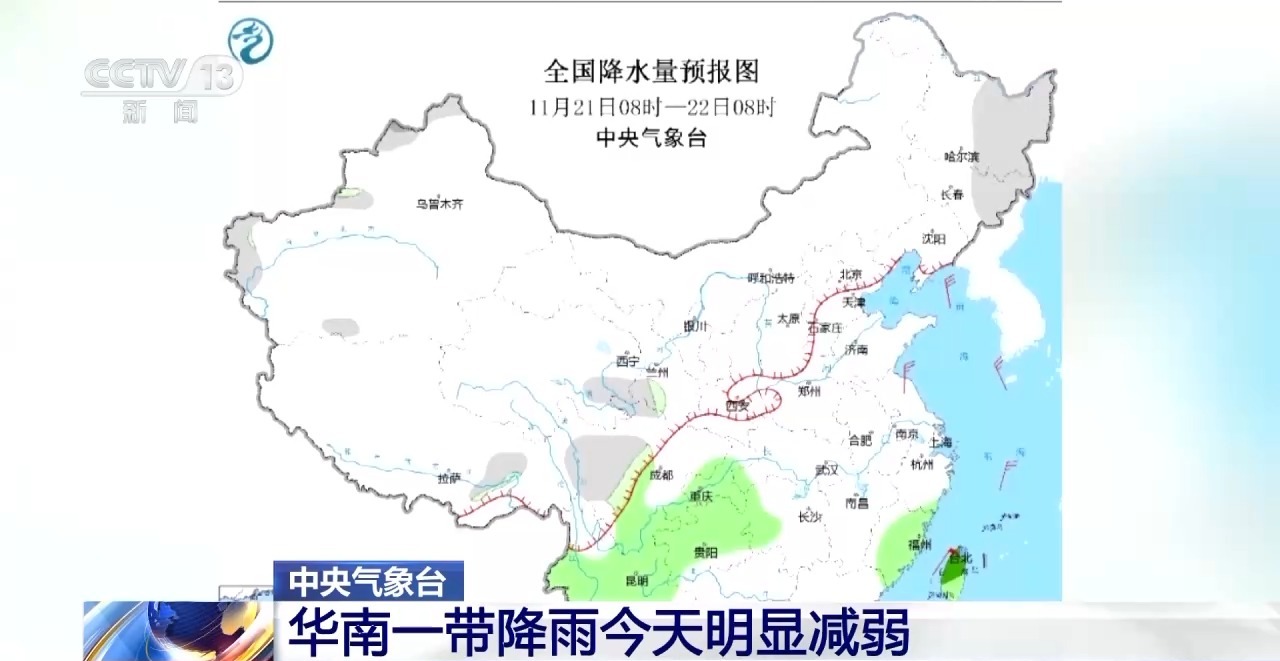 中央氣象台預計,今天(21日),華南等地的降雨將明顯減弱,西藏、青海、川西高原等地還會出現雨雪天氣。另外,一輪寒潮過程正在醖釀中,預計23日起,我國大部地區將出現明顯大風降温以及雨雪天氣。