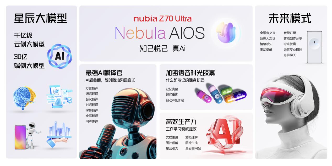 星雲AIOS系統作為努比亞Z70 Ultra的核心亮點之一,為用户帶來了更有温度的AI體驗。該系統在AI的功能價值、效率價值基礎上,進一步賦能用户情緒價值,實現知己、悦己的體驗。星雲AIOS是全行業首個全語音全場景穿透式AI操作系統,除了普通模式之外,還首創了純語音交互模式——未來模式,可實現語音串聯各場景。目前,該系統已實現多種場景下的語音交互,如語音智能訂票、股票盯盤、語音搜圖配文發小紅書等,極大地提升了用户的便捷性和互動性。