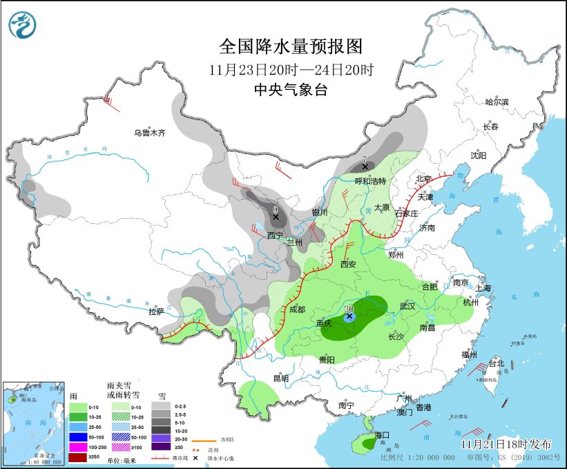 *11月23日20時至24日20時,*新疆南疆西部山區、西北地區中東部、內蒙古中部、山西中北部、川西高原北部、西藏東部等地部分地區有小到中雪或雨夾雪,局地有大雪。西北地區東南部、黃淮西部、江漢、江淮西部、江南中北部、西南地區東部等地部分地區有小雨,其中,湖北西南部、湖南西北部、重慶東部、貴州北部等地部分地區有中到大雨(25~30毫米)。新疆北部、西北地區中東部、內蒙古中西部等地部分地區有4~6級風(見圖3)。