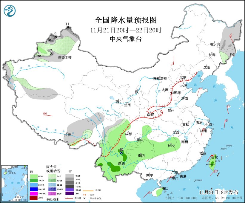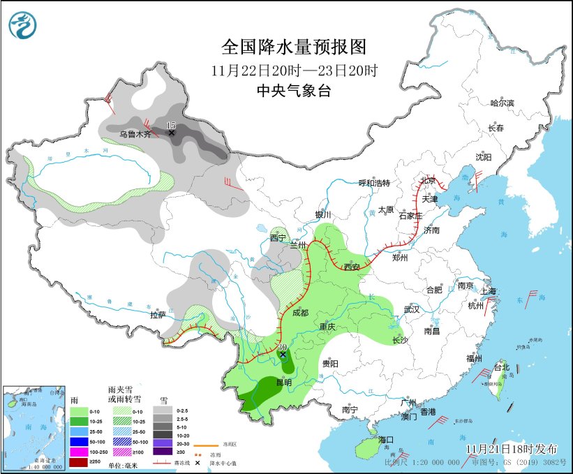 *11月22日20時至23日20時,*新疆北部和東部、甘肅河西、青海東部、西藏東部等地部分地區有小雪或雨夾雪,其中,新疆沿天山地區有中到大雪,局地有暴雪。西北地區東南部、湖南北部、西南地區東部和南部等地部分地區有小雨,雲南西南部和北部局地有中到大雨(25~30毫米)。新疆北部、甘肅河西等地部分地區有4~6級風(見圖2)。
