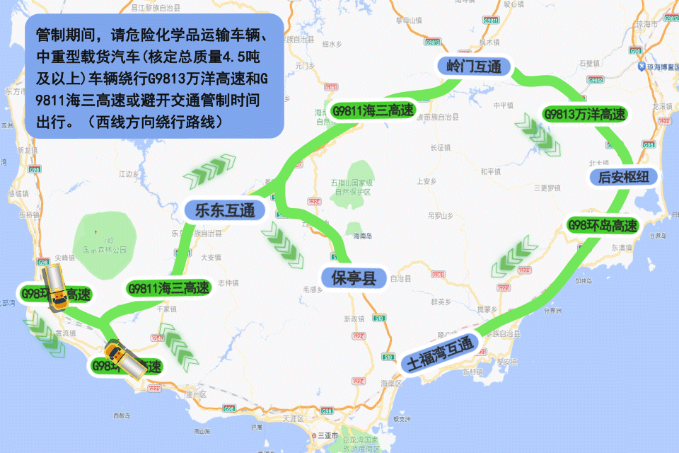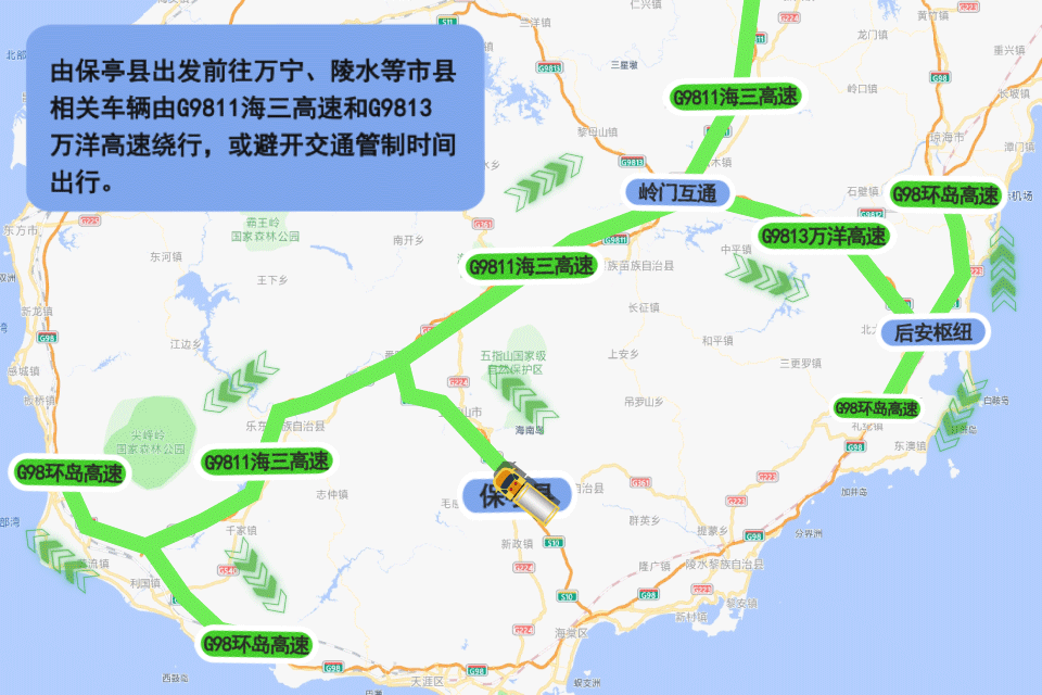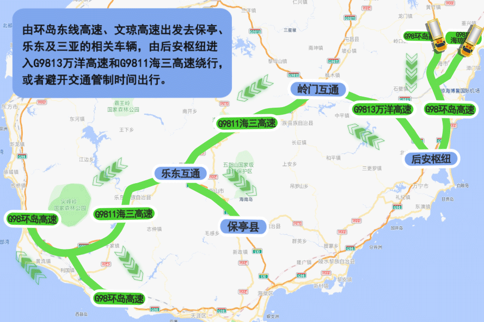 同時,為減輕三亞、陵水地區的道路交通壓力,公安機關對過境三亞、陵水的車輛實施遠端分流管控措施,目的地非三亞、陵水的車輛,請繞行G9813萬洋高速和G9811海三高速或避開交通管制時間出行。