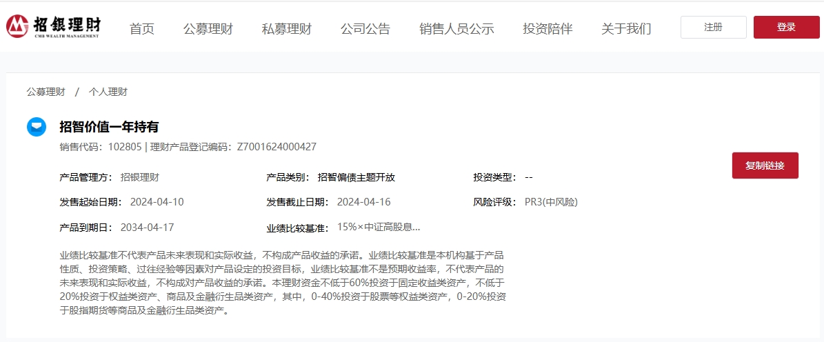 且宣傳海報上提到編碼為“102805”理財產品,指的是“招銀理財招智價值精選一年持有”。從資產投向來看,該產品資金不低於60%投資於的固定收益類資產,不低於20%投資於權益類資產、商品及金融衍生品類資產。其中,0-40%投資於股票等權益類資產,0-20%投資於股指期貨等商品及金融衍生品類資產。