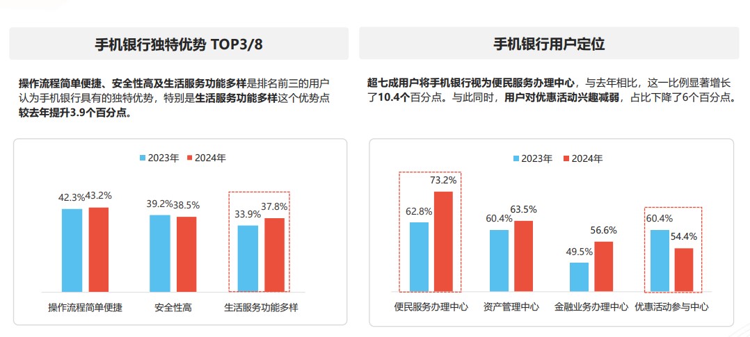 調研發現,超過七成的用户將手機銀行視為便民服務辦理中心,這一比例與去年相比顯著增長了10.4個百分點。這表明,手機銀行在提供金融服務的同時,也在積極拓展便民服務領域,滿足用户日益多樣化的需求。