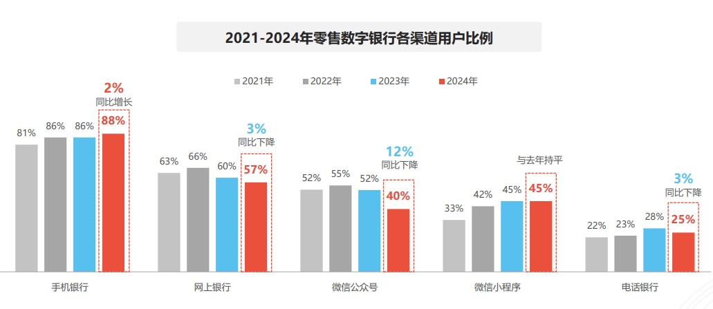 數據顯示,個人手機銀行用户比例已達到88%,同比增長2個百分點。與此同時,其他數字渠道如微信小程序的用户增長停滯,而網上銀行、微信公眾號以及電話銀行的用户比例均有所下滑。這一情況表明,越來越多的用户正在將手機銀行作為他們進行金融交易和獲取金融服務的主要平台。