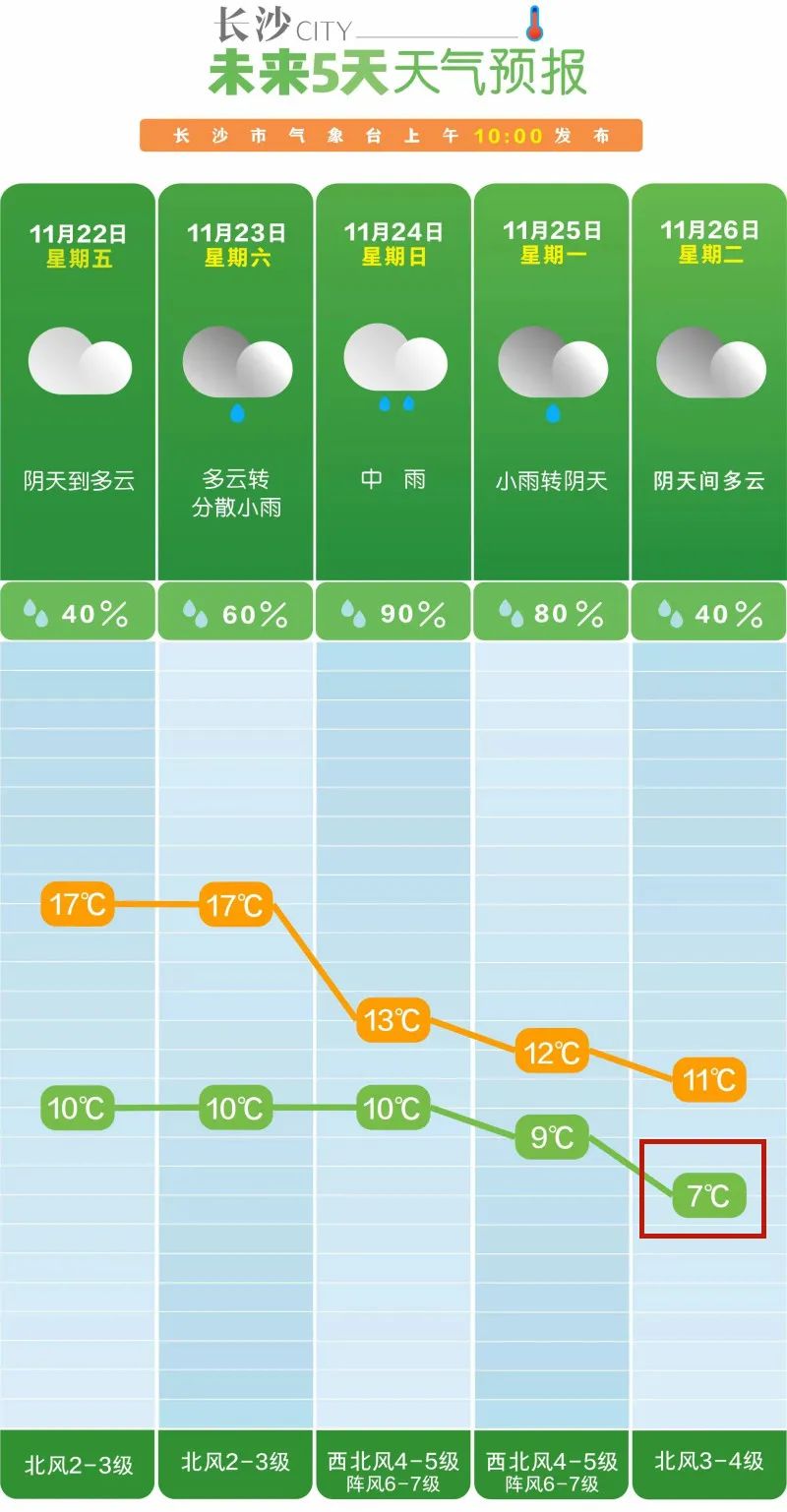“11月以來,長沙降水偏少六到七成,氣温偏高3℃至4℃。”陳婷表示,預計22日,長沙陰天天氣為主,氣温略有回升,最高氣温15℃至17℃;23日到25日,伴隨着新一輪冷空氣南下影響,長沙將迎來一輪降温降雨天氣過程,氣温下降6℃至8℃,北風加大到4到5級,有小到中雨;26日到30日,長沙將迎來久違的晴天,氣温回升,但早晚氣温仍較低,最低氣温3℃至5℃。