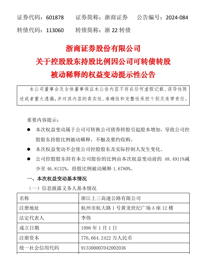 截至2024年11月15日,浙商證券控股股東浙江上三高速公路有限公司(下稱“上三高速”)所持公司股份數量不變,持股比例由可轉債發行前的54.79%被動稀釋至48.49%。