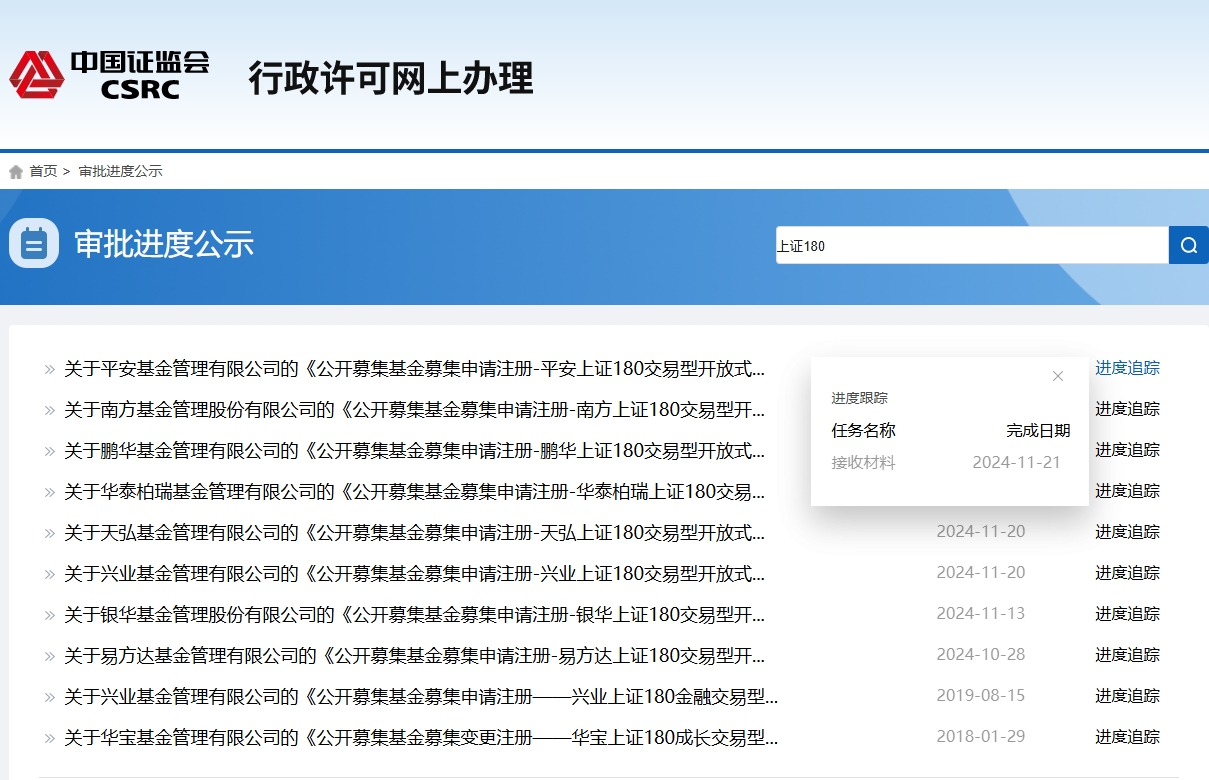 【環球網金融綜合報道】據證監會官網消息,平安基金、南方基金、鵬華基金、華泰柏瑞基金、天弘基金集體上報上證180ETF,11月21日所上報的產品材料已獲監管接收。