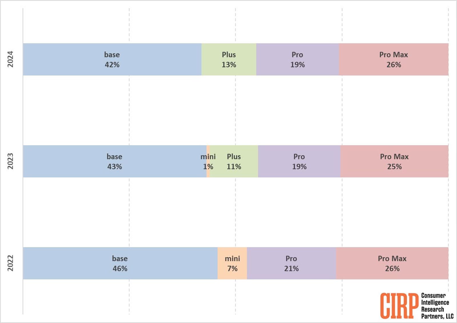 此外,CIRP的數據還揭示了一個明顯的趨勢:消費者越來越偏愛大屏手機。自2014年蘋果推出首款Plus尺寸iPhone以來,大屏手機的市場份額已顯著提升至39%,其中Plus和Pro Max兩款機型佔據了主導地位。這一變化不僅證明了蘋果“巨型手機實驗”的成功,也對其平均售價和毛利率產生了積極影響。