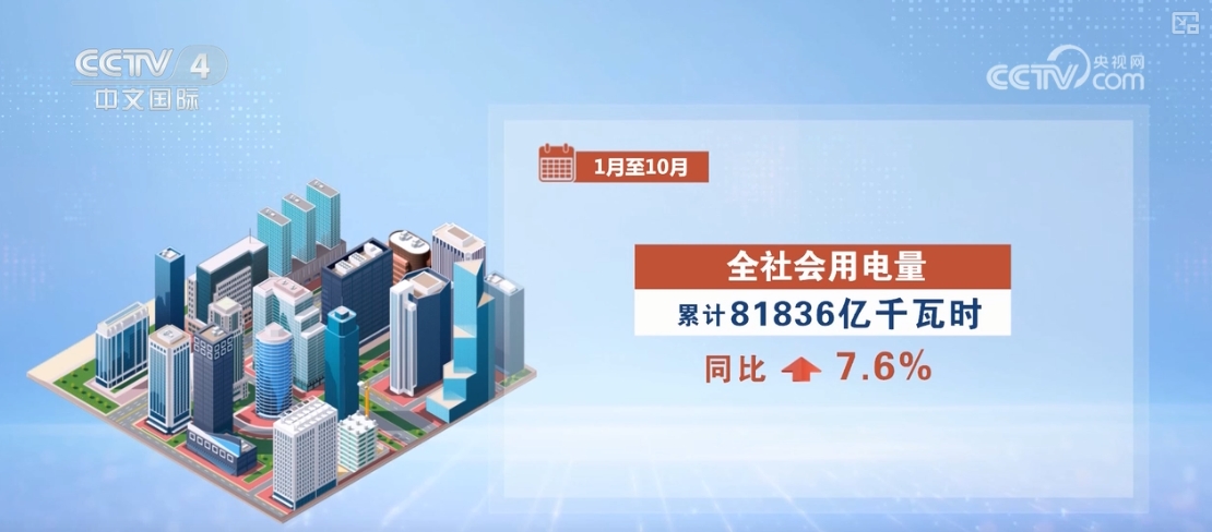 *央視網消息:*用電量被視為經濟運行的“風向標”之一。國家能源局最新公佈的數據顯示,10月份,全社會用電量同比增長4.3%。穩步增長的用電量數據,不僅反映了國民經濟延續回升向好的積極態勢,彰顯了中國經濟的活力,也顯示出經濟結構的優化和新興產業蓬勃向上的動力。