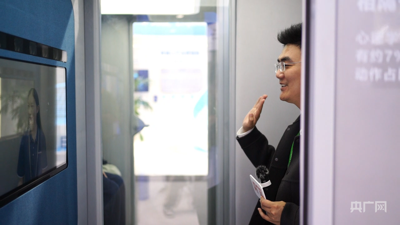 相隔萬里,觸手可及。在裸眼3D視頻通話體驗艙內,身處另一空間的工作人員非常立體地呈現在記者身前的屏幕上,讓記者驚豔不已。