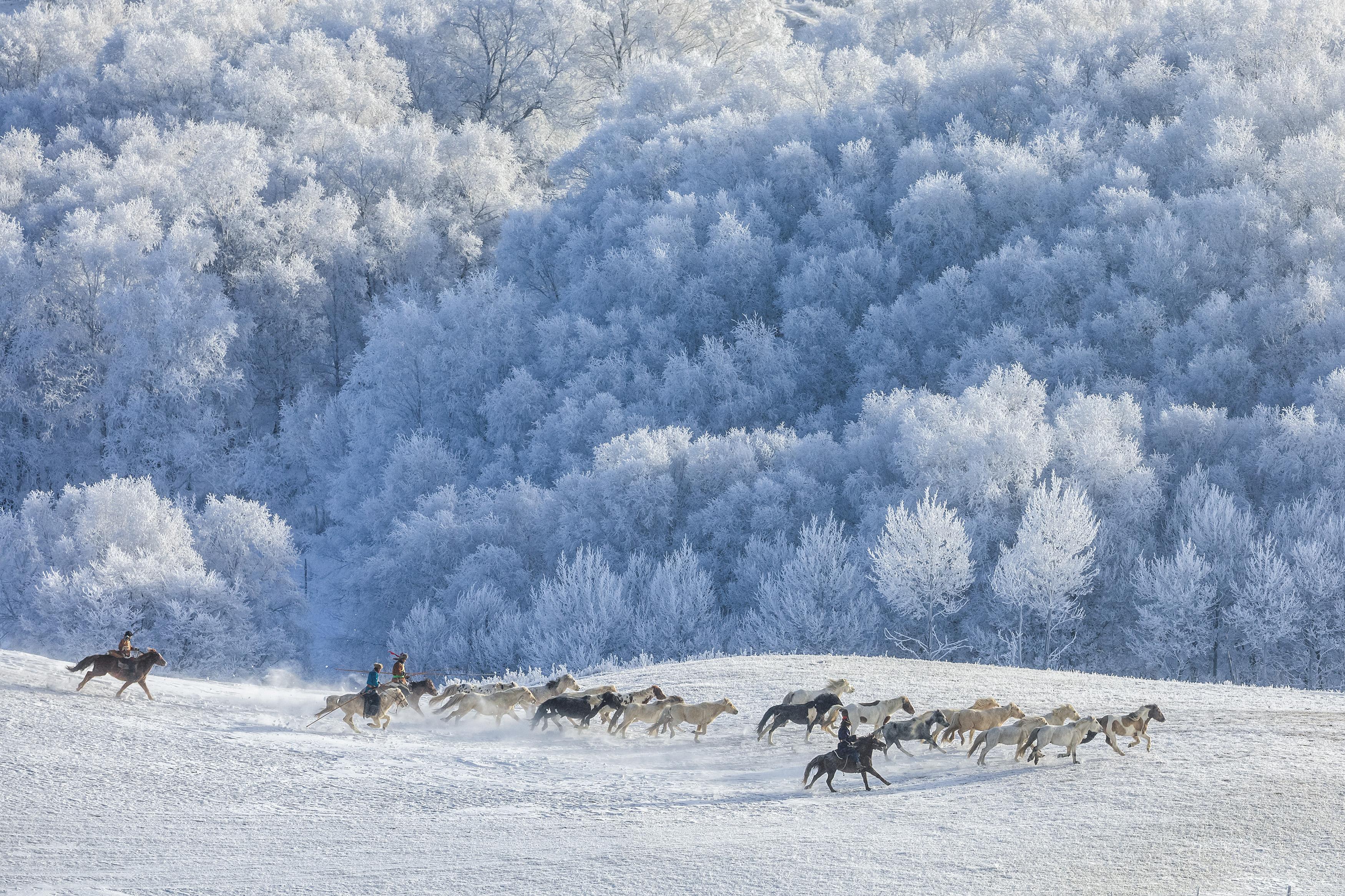 這裏的“詩”,很美。在赤峯烏蘭布統草原,無垠的大地被粉雪淹沒,倔強的白樺林,狹長的不凍河,還有奔騰的駿馬、成羣的牛羊,是雪原上最熾熱的風景。