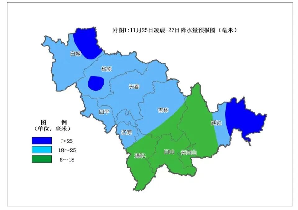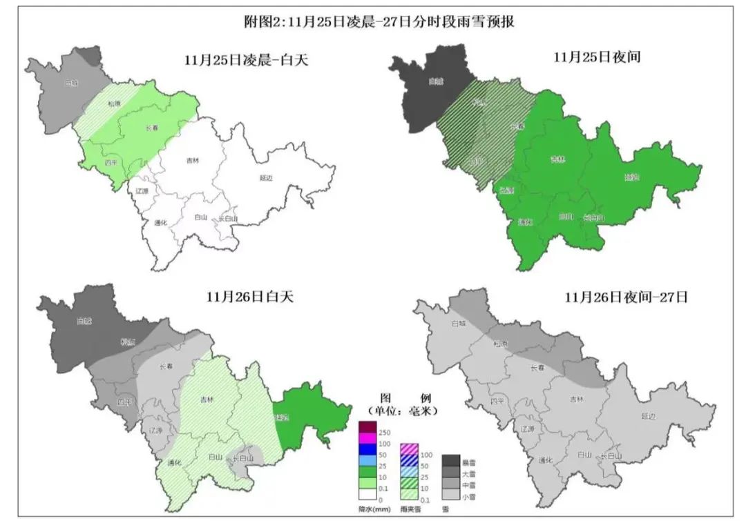 25日夜間,白城有大到暴雪,松原西部和南部、四平西部有小雨或雨夾雪轉大到暴雪,松原東北部、長春西部、四平東部有小雨轉中到大雪,其他地區有小到中雨。