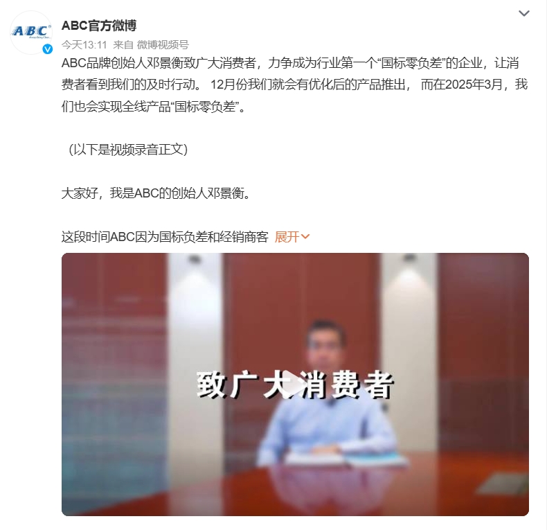 ABC品牌創始人鄧景衡致歉:明年3月全線產品實現國標零負差
