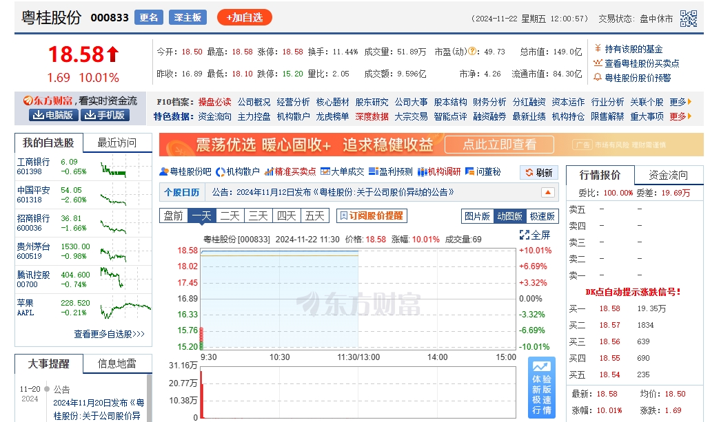 【環球網財經綜合報道】11月22日,粵桂股份再度漲停,截至目前已斬獲10連板。