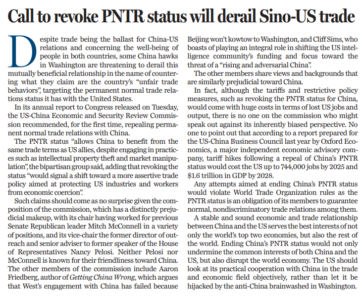 穩定、良好的中美經貿關係不僅符合中美兩大經濟體的最佳利益,也符合世界其他國家的最佳利益。取消中國的永久正常貿易關係地位不僅會損害中美兩國的共同利益,還會擾亂世界經濟。美國政府應客觀看待與中國在經貿領域的務實合作,不要被某些反華政客的一肚子壞水洗了腦。