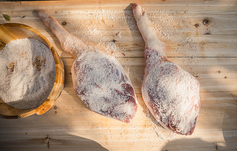 四季分明的亞熱帶氣候,獨特的地理環境,造就了金華火腿獨特的火腿醃製工藝,而金華種豬“兩頭烏”因體型大小適中,骨細、皮薄、肥瘦適度、肉質細嫩、腿心飽滿成為金華火腿醃製的特有原材料。其鮮腿必須爪白、腳直、腿形完好無損,只重在6~7.5公斤之間。
