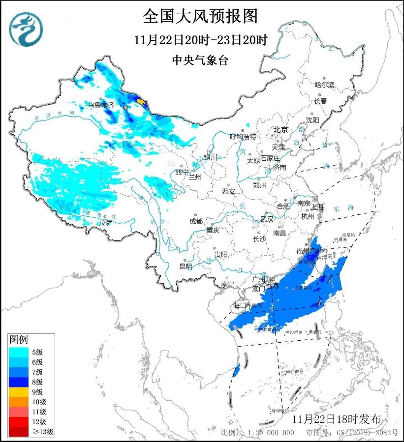 預計,11月22日20時至23日20時,新疆中東部、西藏北部和西部、青海西部、甘肅西部等地將有5至6級、陣風7至8級的大風,其中新疆山口地區將有7至8級、陣風9至11級的大風;台灣海峽、台灣以東洋麪、南海北部海域將有7級、陣風8級的大風;其中台灣海峽部分海域的風力可達8級、陣風9級。