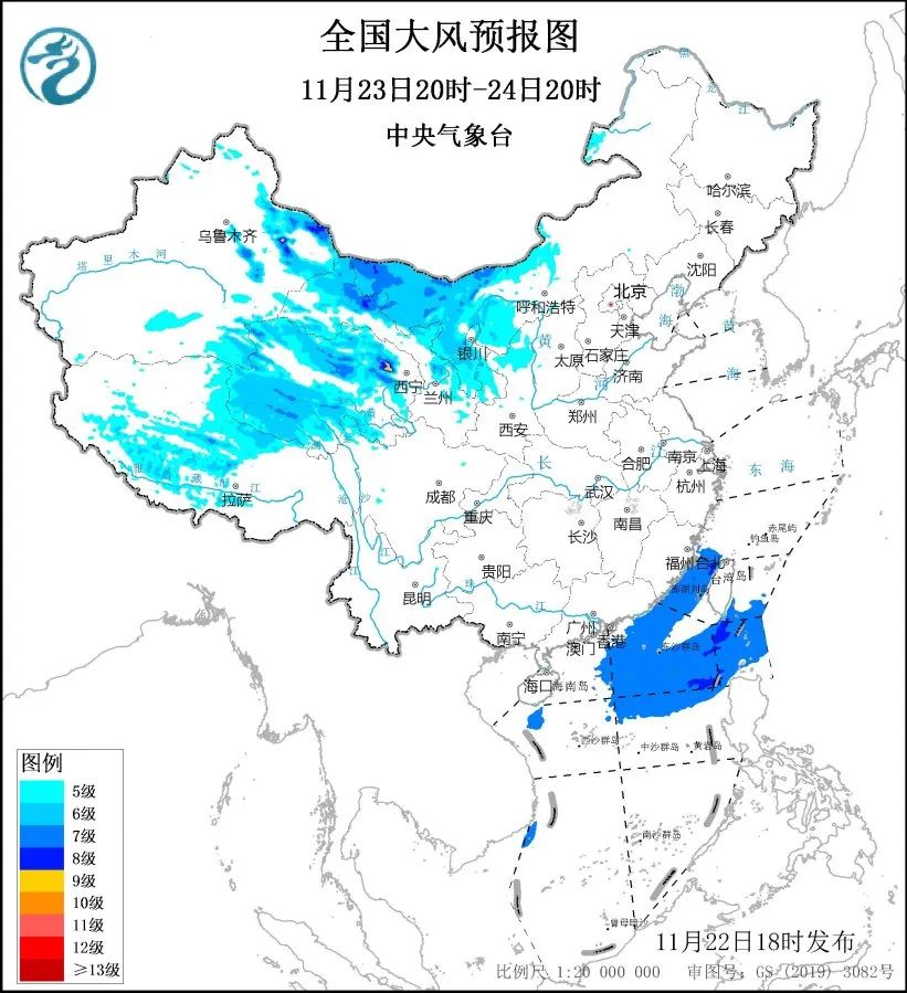 11月23日20時至24日20時,新疆東部、甘肅大部、寧夏、陝西北部、內蒙古西部、西藏大部、青海大部等地將有5至7級、陣風7至8級的大風,其中新疆東部山口地區將有7至8級、陣風9至11級的大風;台灣海峽、台灣以東洋麪、南海東北部海域將有7級、陣風8級的大風;其中台灣海峽、巴士海峽部分海域的風力可達8級、陣風9級。