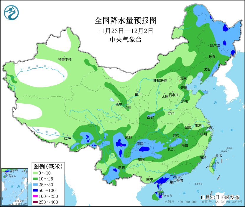 未來10天(11月23日-12月2日),西北地區中東部、華北北部和東部、東北地區、黃淮西部和北部、江南中北部、華南東部、西南地區及內蒙古中東部等地累計降水量有10~30毫米,其中廣西東南部、廣東西南部、海南島東部、貴州北部、四川南部、雲南中部、西藏東南部及黑龍江北部和東部等地部分地區有40~70毫米,海南島東部、四川南部、西藏東南部局地超過100毫米;華北、東北地區、內蒙古、西南地區東部等地降水量較常年同期偏多,我國其餘地區降水偏少。