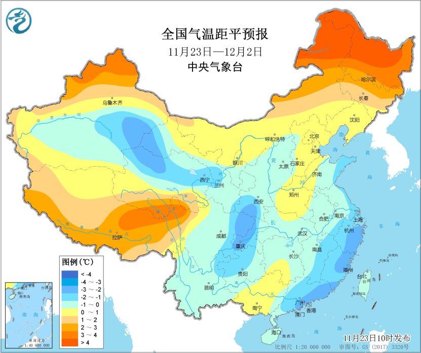 未來11-14天(12月3-6日),西南地區東部、江南大部、湖北、廣西等地累計降水量有5~20毫米,局地超過30毫米,其餘地區降水偏少。我國中東部大部地區氣温較常年同期偏低或接近常年同期,其中東北地區南部、江南東部、廣東、雲南等地平均氣温較常年同期偏低2~3℃。