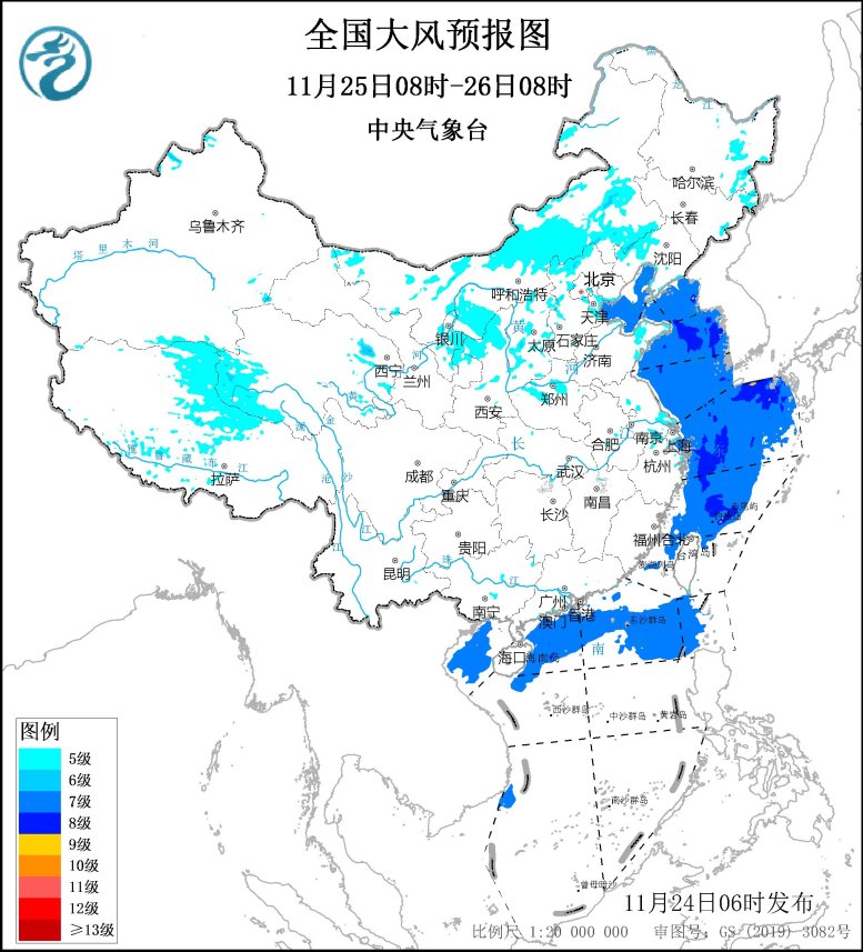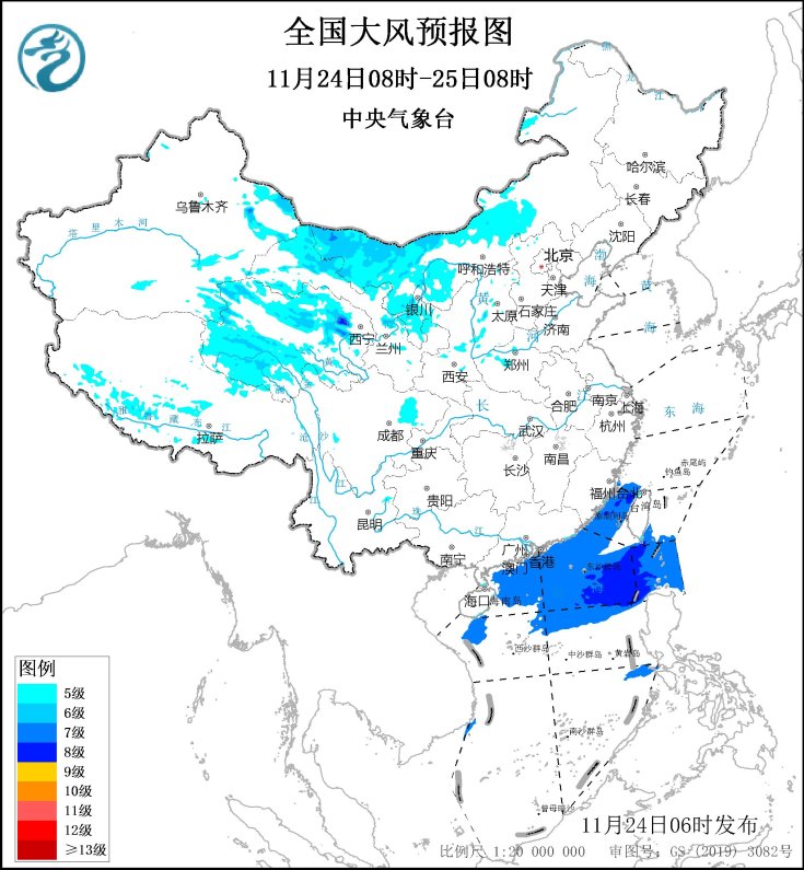預計,11月24日08時至25日08時,青海大部、甘肅河西、寧夏大部、內蒙古中西部、陝西中部、山西西部、河北西北部等地大部有5~6級、陣風7級的大風;台灣海峽、巴士海峽、南海北部海域將有7~8級、陣風9級的大風。