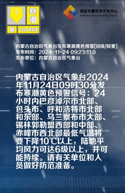 內蒙古自治區氣象台2024年11月24日09時30分發布寒潮黃色預警信號:*24小時內巴彥淖爾市北部、包頭市、呼和浩特市北部和東部、烏蘭察布市大部、錫林郭勒盟西部和中部、赤峯市西北部最低氣温將要下降10℃以上,陸地平均風力可達6級以上,並可能持續。*請有關單位和人員做好防範準備。