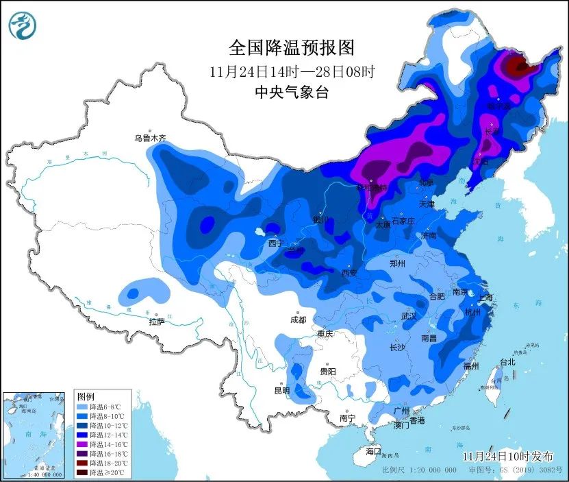 受寒潮影響,預計,11月24日14時至11月28日08時,我國大部地區氣温將先後下降6~10℃,其中,西北地區東部、華北北部、內蒙古及東北等地部分地區降温12~14℃,局地16℃以上。28日前後,最低氣温0℃線將南壓至蘇皖北部至河南南部一帶,其中,大別山、黃山等高海拔山區最低氣温也將低於0℃。