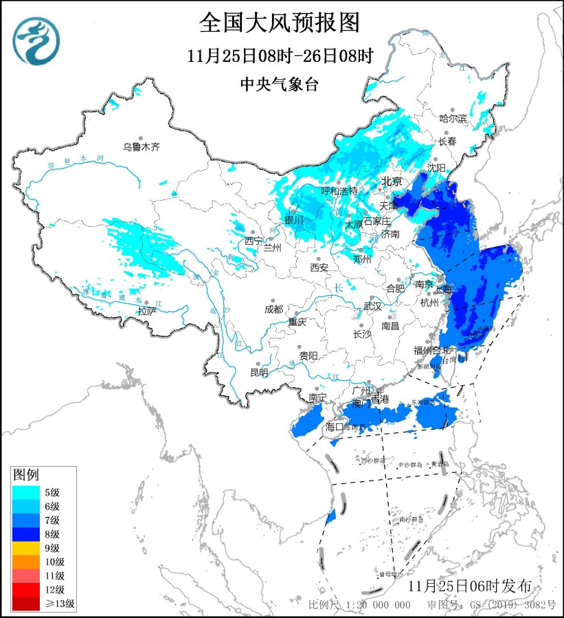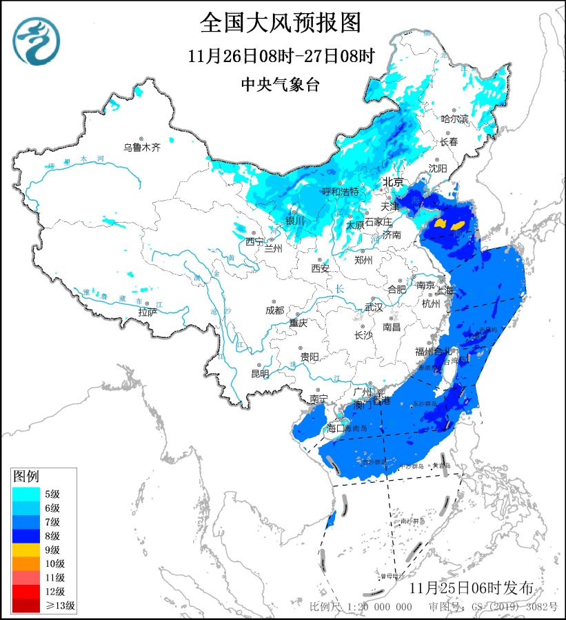 預計,11月25日08時至26日08時,內蒙古大部、西藏北部、寧夏北部、陝西北部、山西中北部、河北西北部、遼寧大部等地部分地區有5~6級、陣風7~8級的大風;渤海、渤海海峽、黃海大部海域、東海大部海域、台灣海峽、南海北部海域、北部灣將有7~8級、陣風9級的大風,其中黃海東部部分海域風力可達9級、陣風10級。