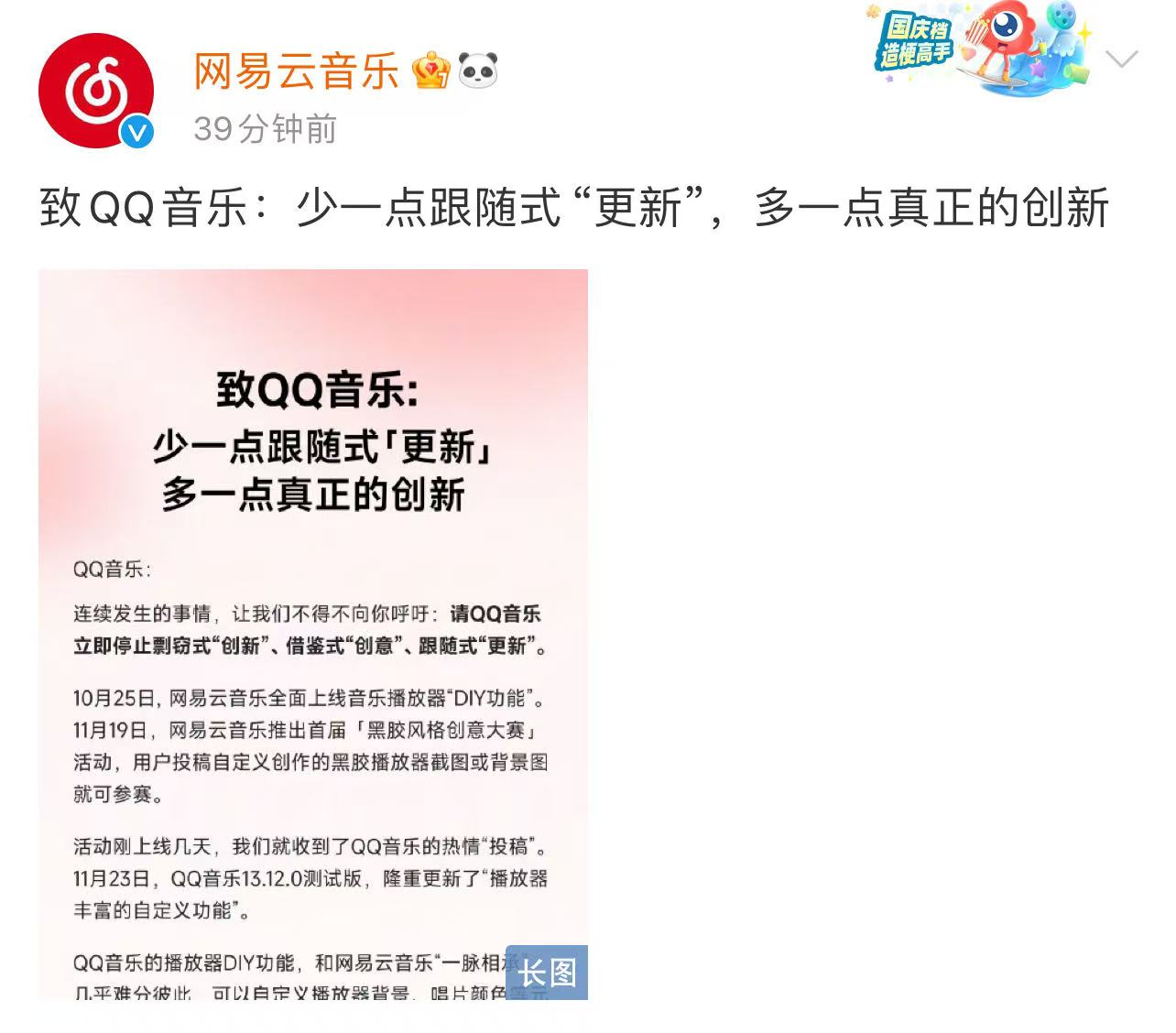 網易雲音樂官方聲明稱,網易雲音樂音樂播放器DIY功能於10月25日上線,用户可上傳圖片個性化定義播放器界面。11月19日,網易雲音樂推出以此功能為主題的首屆「黑膠風格創意大賽」,吸引大量用户參與。然而,僅四天後,QQ音樂便推出了高度相似的“播放器自定義功能”,再次抄襲網易雲音樂。網易雲音樂還在聲明中詳細回顧了QQ音樂近年來被指“模仿”、抄襲網易雲音樂的黑膠播放頁面、一起聽、故宮主題播放器等事件,並要求QQ音樂立即停止一直以來的剽竊式“創新”、借鑑式“創意”、跟隨式“更新”行為。