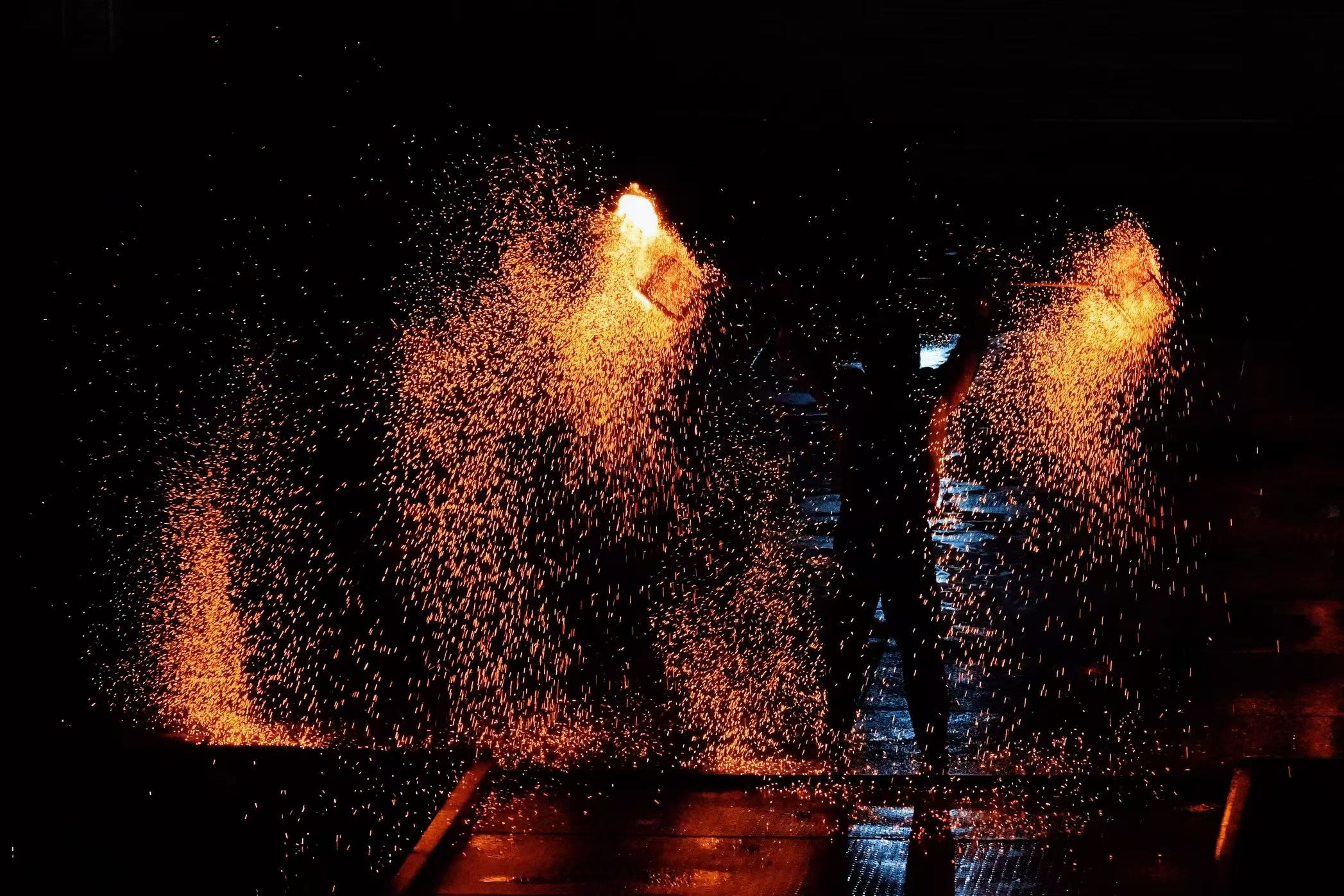 夜幕降臨,華燈初上,一位位打鐵匠人舞動着1600多℃的高温鐵水,千朵萬朵鐵花瞬間在空中綻放,猶如繁星點點,呈現出“火樹銀花不夜天”的盛景。