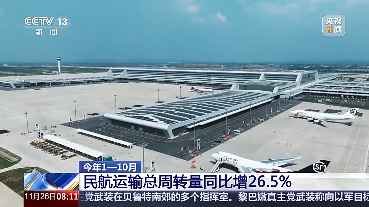 今年1—10月,民航全行業共完成運輸總週轉量1238.3億噸公里,同比增長26.5%;完成旅客運輸量6.2億人次,同比增長18.6%;完成貨郵運輸量729.8萬噸,同比增長23.9%。運輸總週轉量、旅客運輸量以及貨郵運輸量三大指標較2019年同期均實現兩位數增長,特別是國際航線貨郵運輸量大幅增長48.5%。