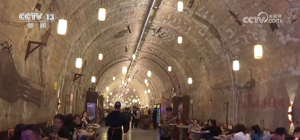 除了在空中“解鎖”山城的特質,一些新消費場景也延伸到地下。在重慶渝北區,這家防空洞火鍋佔地5000平方米,相當於6個足球場大小,在這裏可以同時容納1300人用餐。